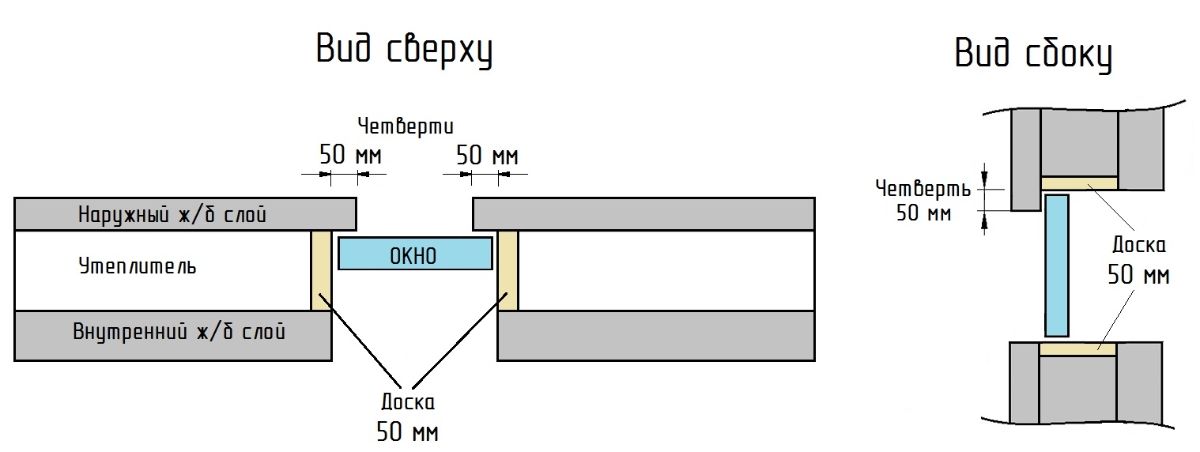 Для монтажа окон и дверей в оконных и дверных проемах между ж/б слоев устанавливается деревянная доска толщиной 50 мм на всю ширину утеплителя, с помощью крепежа доска надежно замоноличивается. Также в наружном ж/б слое в оконных проемах формируются так называемые «четверти» для более качественного монтажа окон.