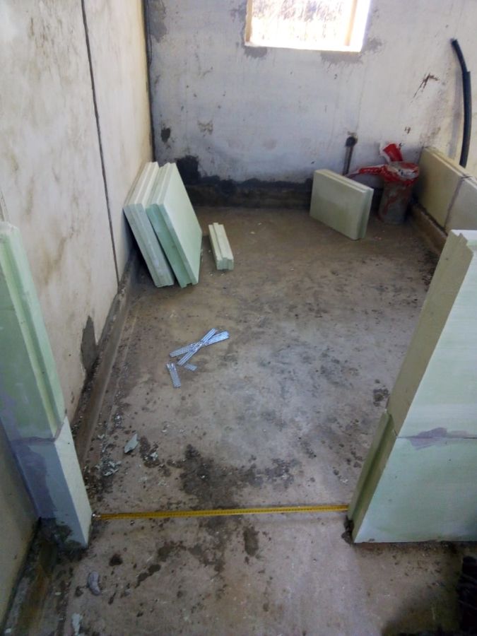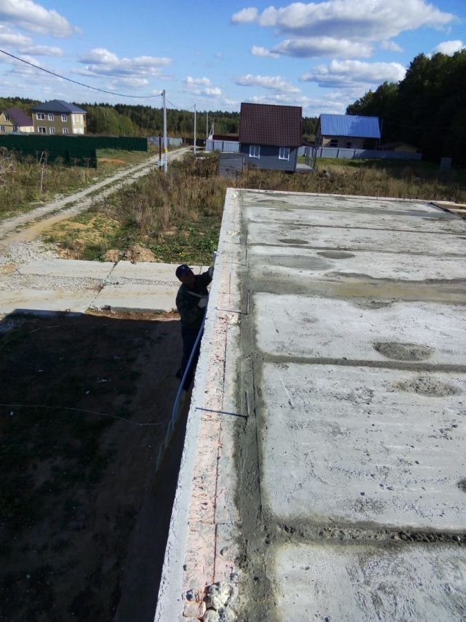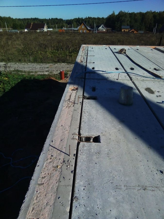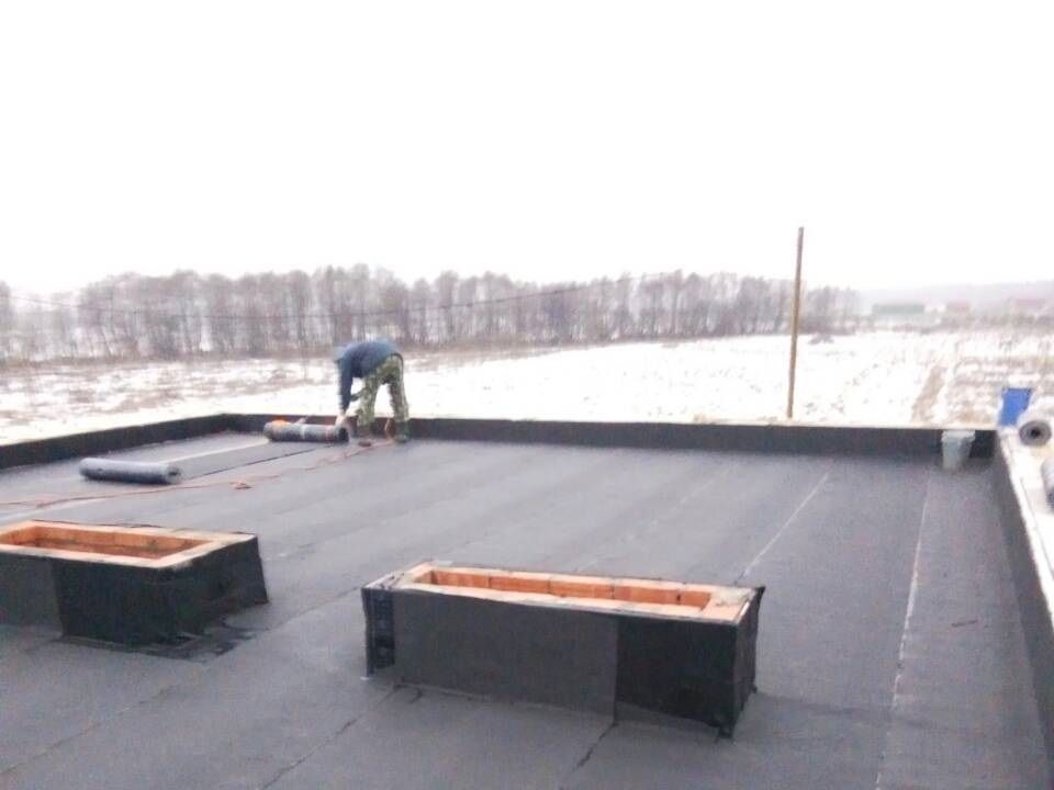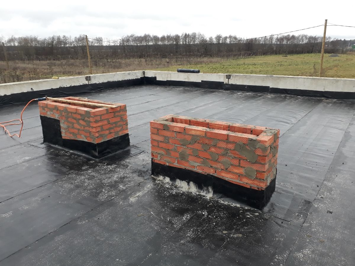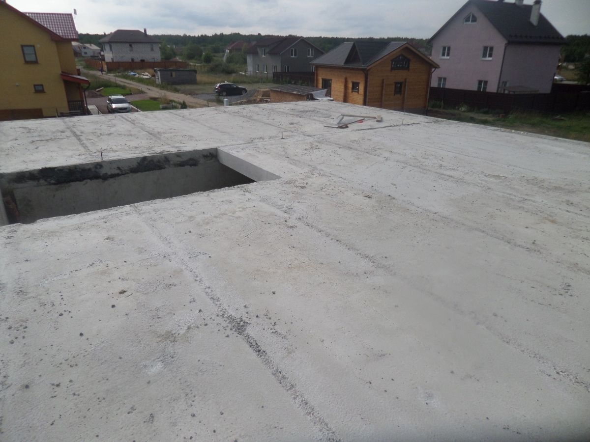 Устройство плоской крыши производится по железобетонным плитам перекрытия, с установкой железобетонных парапетов по всему периметру дома. Перекрытие утепляется эсктрудированным пенополистиролом, делается разуклонка, нижний слой гидроизоляции и двойной слой верхней гидроизоляции. Также устраиваются водосточные воронки, вентиляционные и дымоходные каналы.
