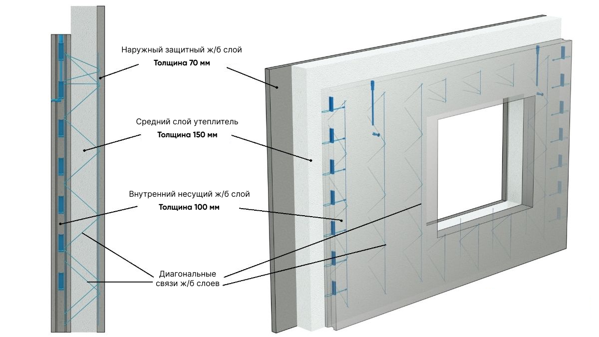Внутренний и наружный ж/б слои изготавливаются из тяжелого бетона класса В25 на гранитном щебне и стальной арматуры класса А500С. В зависимости от проектных расчетов, закладывается двойная сетка из арматуры во внутреннем слое и одинарная в наружном. Наружный и внутренний ж/б слои соединяются друг с другом при помощи жестких диагональных связей из нержавеющей стали PD и PPA финского производителя Peikko Group.