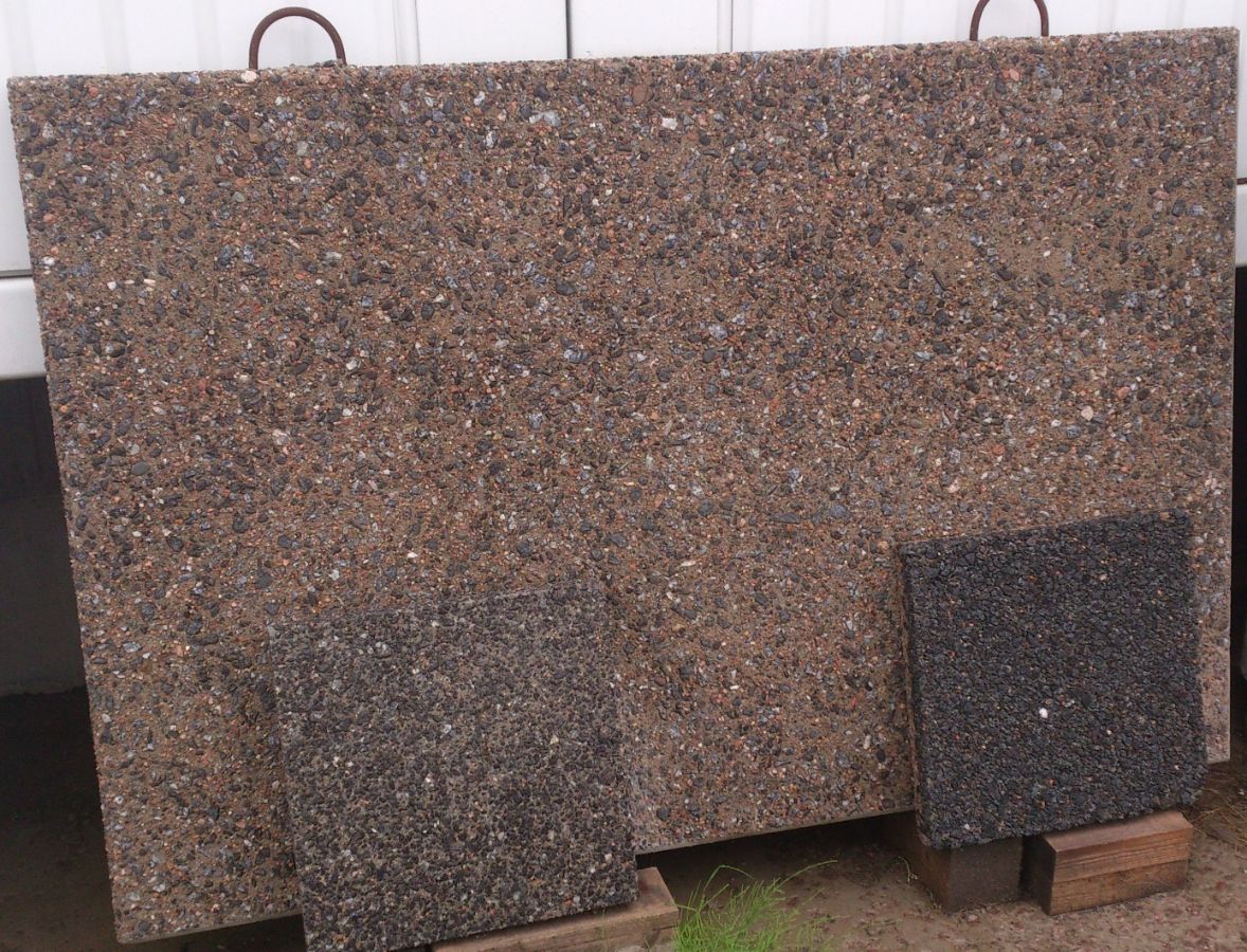 • Отмыв заполнителя. Для создания данной фактуры в процессе производства на наружную поверхность панели наносится специальный состав, препятствующий застыванию небольшого слоя бетона глубиной 3-5 мм. После застывания основной массы бетона и подъема панели в вертикальное положение, незастывший слой смывается напором воды и, присутствующий в бетонной смеси гранитный щебень, появляется на поверхности. Фасад получается, как бы, обсыпан маленькими гранитными камушками. Данное решение не требует окрашивания.