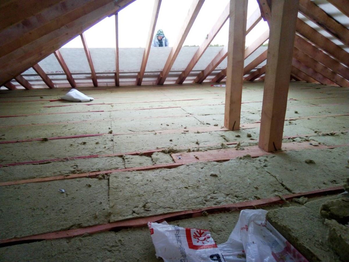 При наличии холодного чердака в Вашем доме, чердачное перекрытие выполняется по деревянным балкам с шагом 600 мм, между которыми укладывается слой утеплителя (минеральной ваты) толщиной 200 мм, затем сверху перекрытия перекрестно укладывается еще один слой минеральной ваты толщиной 100 мм. Таким образом, общая толщина утеплителя составляет 300 мм, такое утепление входит в базовую комплектацию наших домов. Снизу перекрытие подшивается пароизоляционной пленкой для предотвращения попадания влаги изнутри помещения в утеплитель.