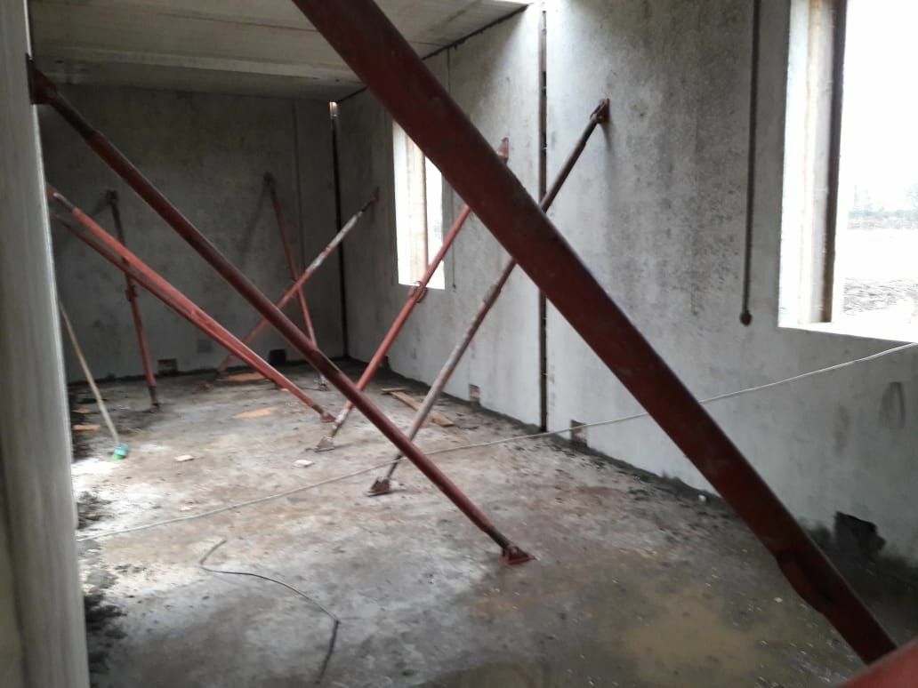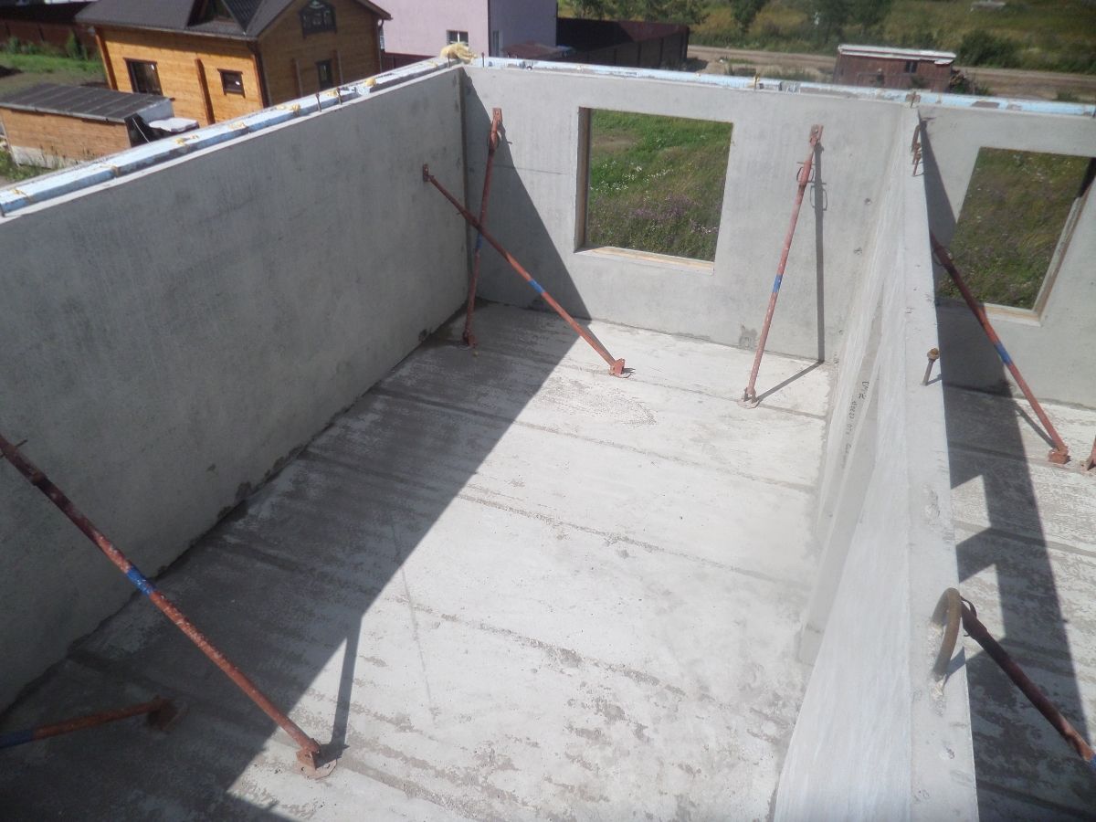 После схватывания бетона в монолитных участках, временные опоры (подкосы) снимаются и можно приступать к монтажу панелей следующего этажа.