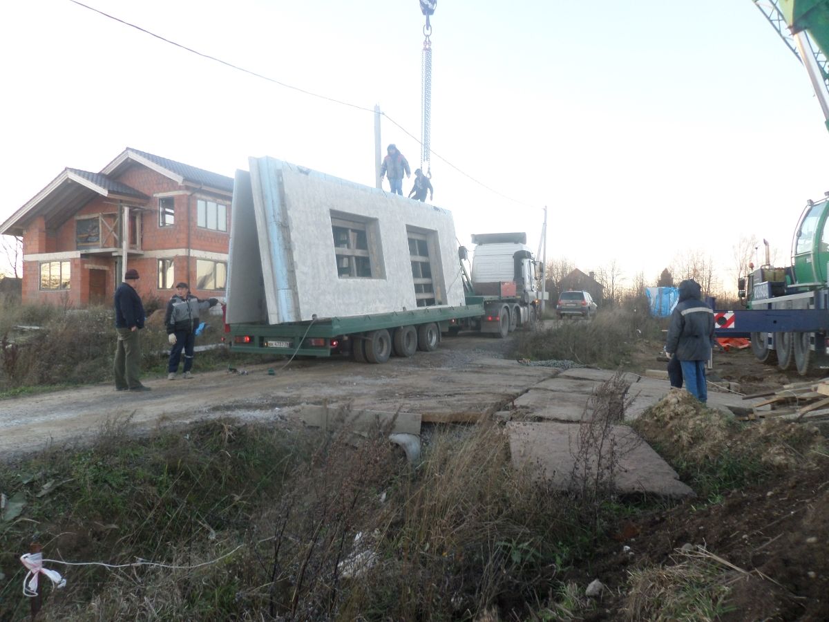 Стеновые панели доставляются с завода панелевозами, стандартный панелевоз может привезти панели общей длиной 2Х7,8 метра и общей массой не более 20 тн. Как правило, стеновые панели для двухэтажного дома 10х10 метров доставляются 10 рейсами стандартных панелевозов. Как правило, доставка и монтаж стеновых панелей производится в один день.